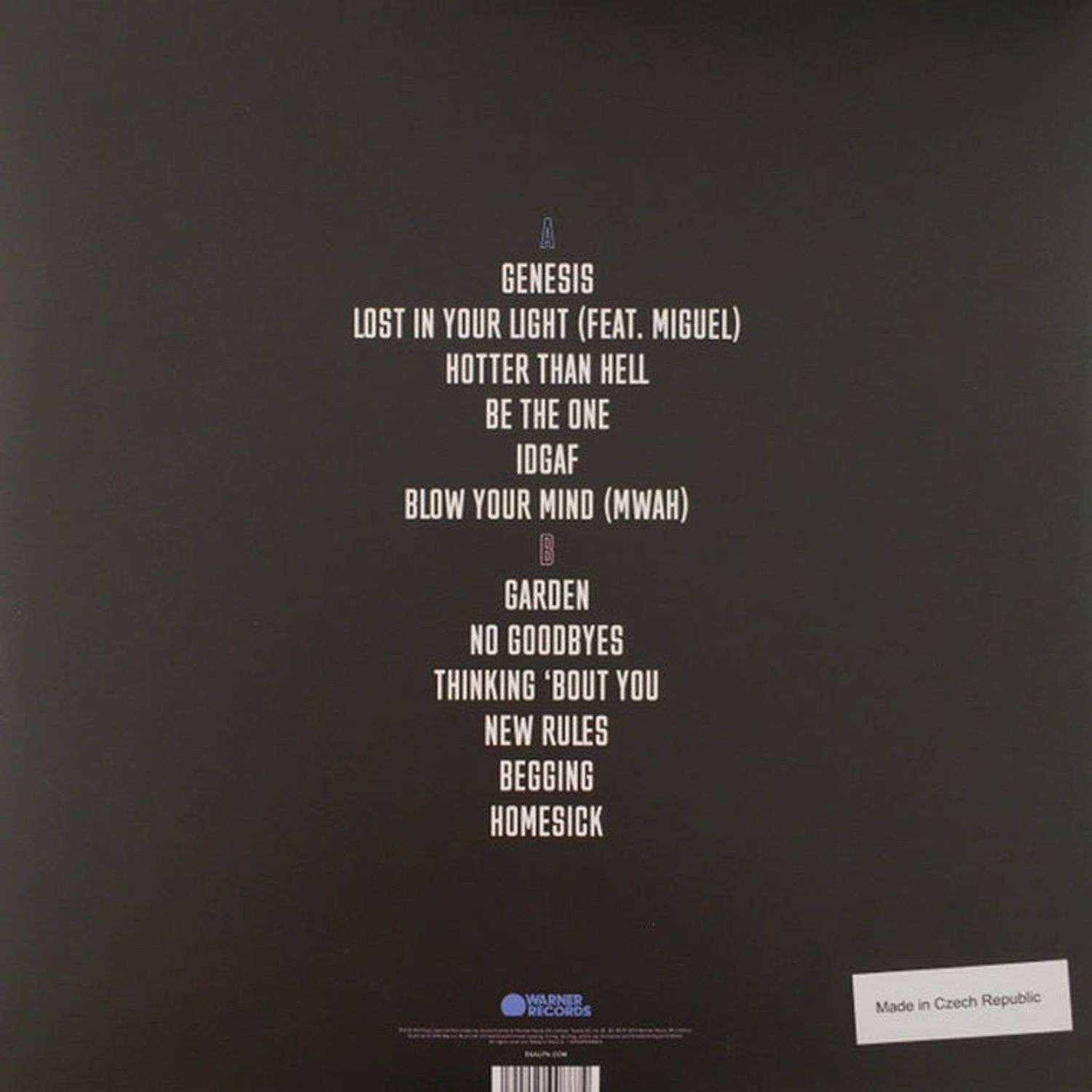 A1. Genesis A2. Lost In Your Light A3. Hotter Than Hell A4. Be The One A5. IDGAF A6. Blow Your Mind (Mwah) B1. Garden B2. No Goodbyes B3. Thinking 'Bout You B4. New Rules B5. Begging B6. Homesick